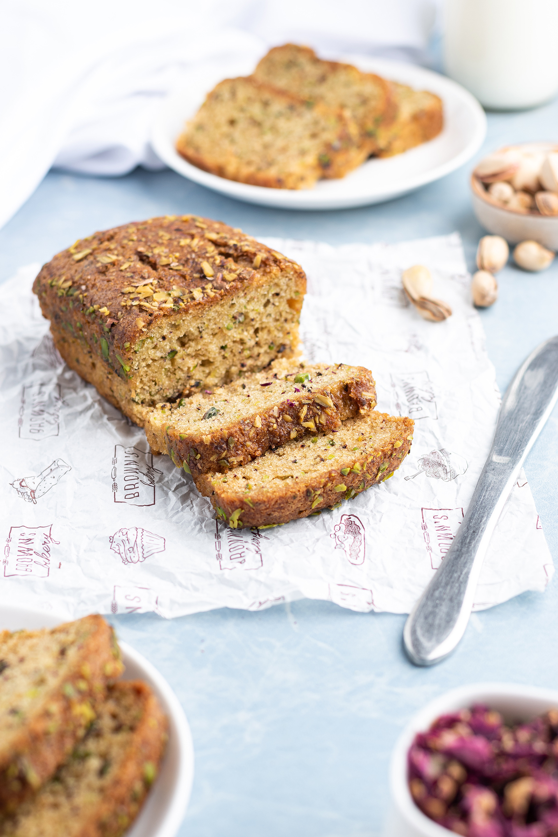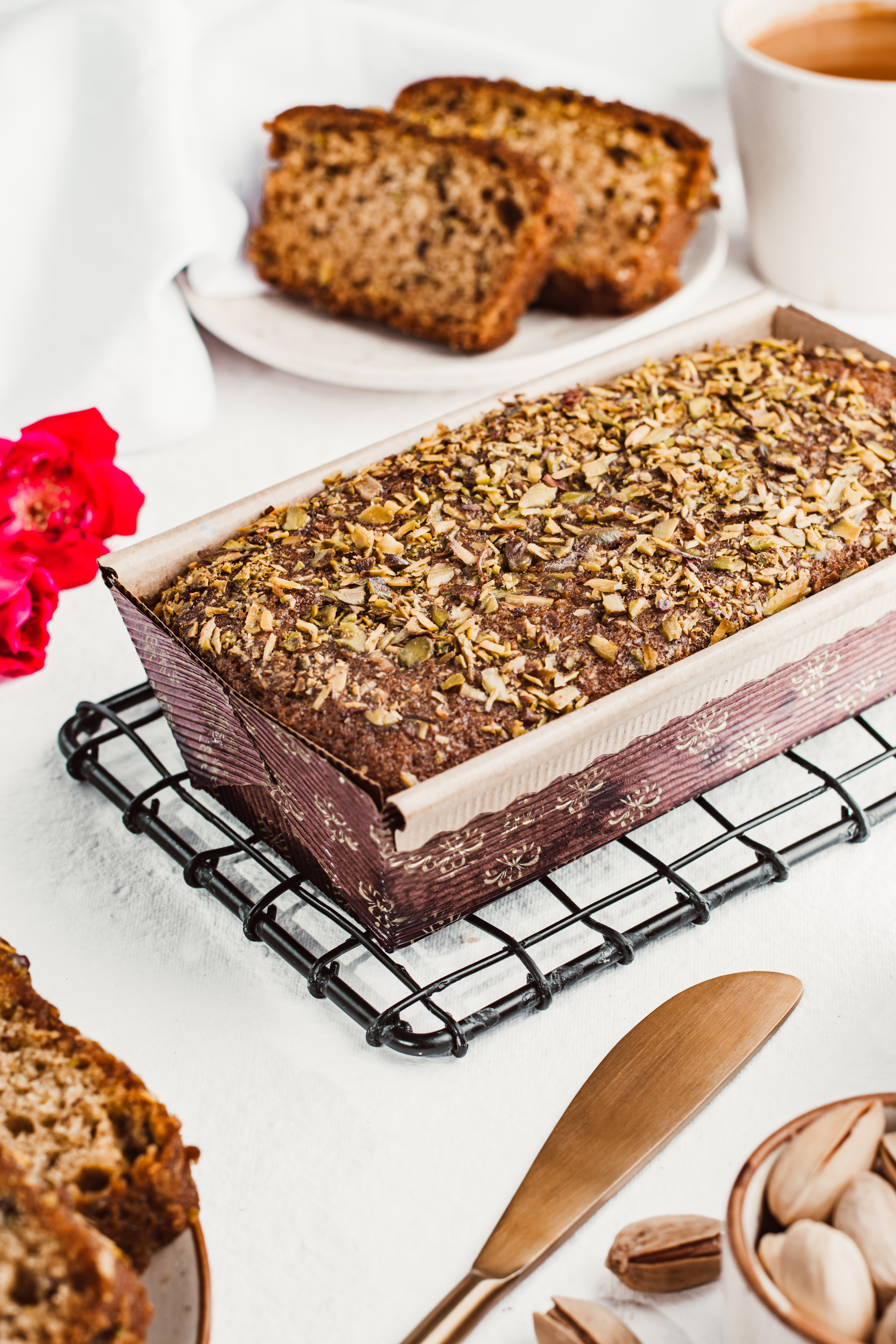 Pistachios and rose tea cake